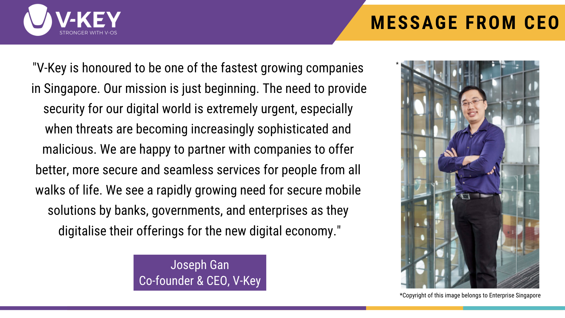 Our title as an SG:D accredited company by the Infocomm Media Development Authority of Singapore (IMDA) has been vital in positioning us as a qualified contender to government and large enterprise buyers. The strict evaluation criteria of the Accreditation@SGD programme provides prospective clients with the assurance of V-Key’s ability to deliver and the robust nature of its product. Enterprise Singapore has also been instrumental in our global expansion plans with its large ecosystem of key contacts and partnerships.
